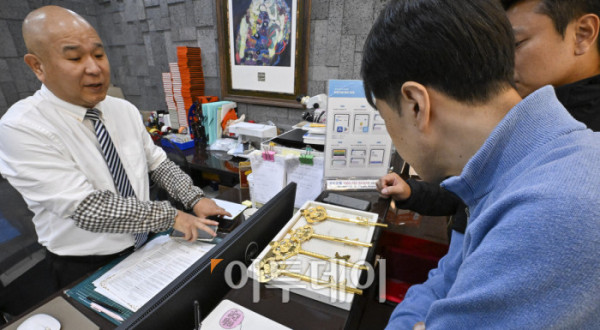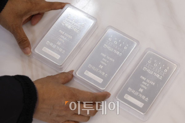 ▲글로벌 경제 불확실성 속 금·은 가격이 연일 최고치를 경신하며 시장의 품귀 현상도 심해지고 있다. 금융권에 따르면 한국금거래소는 국민·우리·신한·농협은행에 20일∼내년 1월1일까지 실버바 공급을 중단한다고 통보했다. 이에 따라 이들 시중은행은 이번 주 중으로 실버바 판매를 중단할 예정이다. 국제 은값은 뉴욕상품거래소(COMEX)에서 17일(현지시간) 12월 인도분 은 선물가격은 트라이온스당 장중 역대 최고가인 53.77달러까지 상승했다가 50.10달러 마감했다. 12월 인도분 금 선물은 같은 날 온스당 4213.30달러에 마감했다. 국제 금값은 최근 4300달러선을 돌파한 뒤 고공행진 중이다. 이날 서울 종로구 한국금거래소에서 한 시민이 구매한 실버바를 확인하고 있다. 조현호 기자 hyunho@