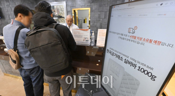 ▲글로벌 경제 불확실성 속 금·은 가격이 연일 최고치를 경신하며 시장의 품귀 현상도 심해지고 있다. 금융권에 따르면 한국금거래소는 국민·우리·신한·농협은행에 20일∼내년 1월1일까지 실버바 공급을 중단한다고 통보했다. 이에 따라 이들 시중은행은 이번 주 중으로 실버바 판매를 중단할 예정이다. 국제 은값은 뉴욕상품거래소(COMEX)에서 17일(현지시간) 12월 인도분 은 선물가격은 트라이온스당 장중 역대 최고가인 53.77달러까지 상승했다가 50.10달러 마감했다. 12월 인도분 금 선물은 같은 날 온스당 4213.30달러에 마감했다. 국제 금값은 최근 4300달러선을 돌파한 뒤 고공행진 중이다. 이날 서울 종로구 한국금거래소 모니터에 '실버바 제품 수령시 4개월 소요' 안내문이 나오고 있다. 조현호 기자 hyunho@