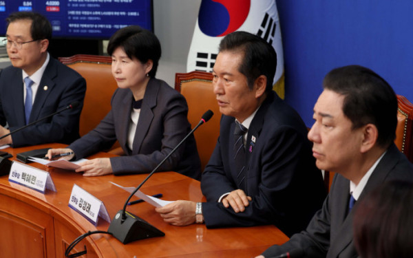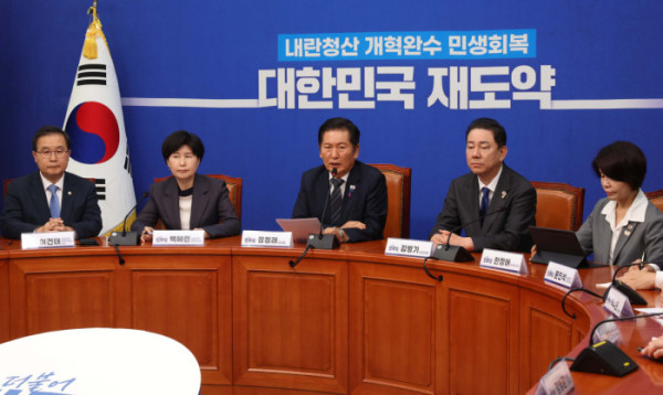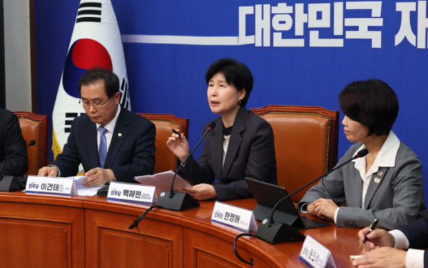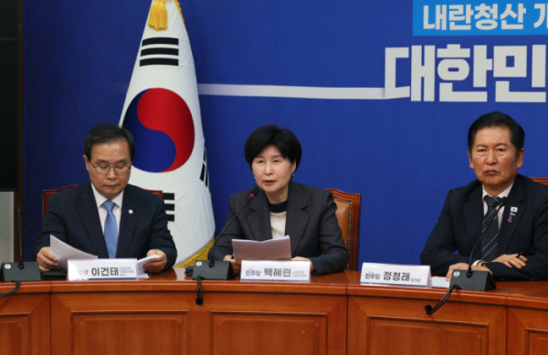 ▲정청래 더불어민주당 대표와 김병기 원내대표가 20일 서울 여의도 국회에서 열린 민주당 사법개혁특별위원회의 사법개혁안 발표에 참석하며 백혜련 사개특위 위원장 등과 인사하고 있다. 신태현 기자 holjjak@