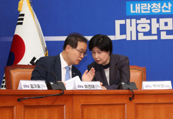 ▲백혜련(오른쪽) 더불어민주당 사법개혁특별위원회 위원장과 이건태 사개특위 간사가 20일 서울 여의도 국회에서 사법개혁안 발표에 앞서 대화하고 있다. 신태현 기자 holjjak@