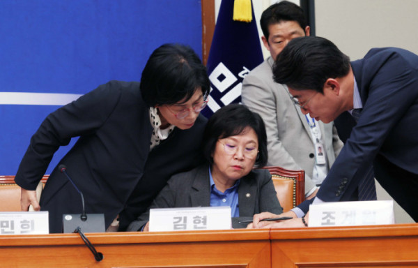 ▲최민희(왼쪽부터) 더불어민주당 언론개혁특별위원회 위원장, 김현 부위원장, 노종면 간사가 20일 서울 여의도 국회에서 언론개혁안 발표에 앞서 대화하고 있다. 신태현 기자 holjjak@