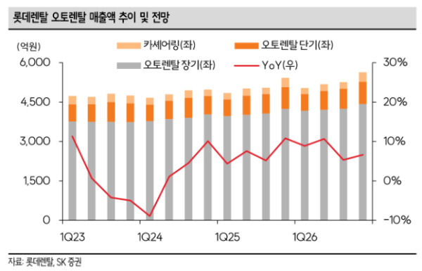 윤혁진 SK증권 연구원은 "롯데멘탈 올해 3분기 매출액은 7557억 원, 영업이익 870억 원으로 추정된다"며 "오토렌탈 장기 매출액이 장기 수주대수 및 순증대수가 지속 증가하며 전사 매출액 성장을 이끌고, 중고차 매각 매출액도 중고차 반납과 소비자 대상(B2C) 매각이 확대되고 전반적으로 높은 중고차 시장 가격이 반영돼 증가한 것으로 추정된다"고 말했다.