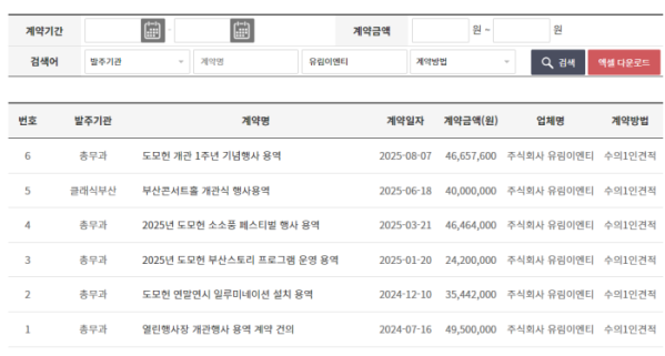 이투데이가 나라장터를 통해 확인한 결과, 부산시 총무과와 클래식부산은 강서구 강동동 소재 ㈜유림이엔티와 총 2억4226만 원 규모의 6건 용역을 수의계약으로 진행했다. 해당 업체는 상시 근로자 3명, 대표이사는 1957년생 여성으로 등록된 소규모 전시업체다.