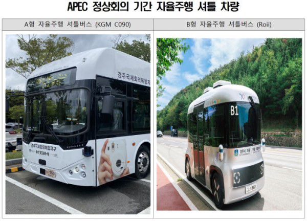 국토교통부와 한국교통안전공단은 APEC 기간 중 행사가 개최되는 경주 보문단지 일원에서 자율주행 셔틀버스를 운행한다고 22일 밝혔다.