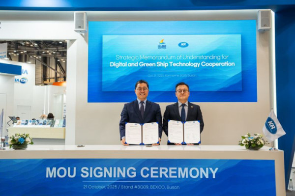 한국선급(KR)은 22일 부산에서 열린 '코마린2025(KORMARINE 2025)' 현장에서 에이치라인해운과 해운산업의 디지털 전환 및 친환경 기술개발을 위한 '기술협력 양해각서(MOU)'를 체결했다고 밝혔다.