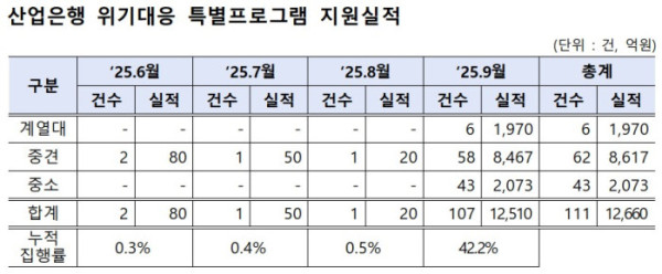 산업은행이 미국발(發) 관세 충격에 대비해 마련한 '위기대응 특별 프로그램'의 초기 집행률이 1%에도 못미치는 것으로 드러났다. '밀어내기식 자금 집행' 우려가 커지는 가운데 중소기업 중심의 맞춤형 지원을 강화해야 한다는 지적이 나온다.
