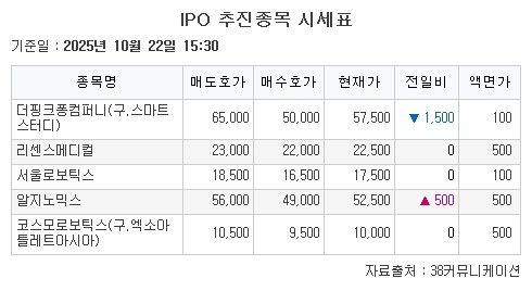 상장 예비심사 청구종목으로 급속정밀냉각 기술 의료기기 제조기업 리센스메디컬과 산업용 자율주행 소프트웨어 전문업체 서울로보틱스는 보합이었다.