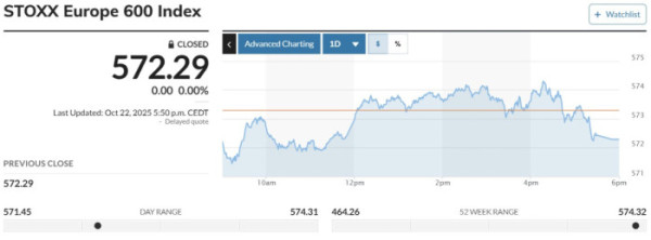 범유럽 주가지수인 스톡스유럽600 지수는 전 거래일 대비 1.01포인트(0.18%) 오른 572.29에 마감했다. 독일 프랑크푸르트증시 DAX30지수는 178.90포인트(0.74%) 하락한 2만4151.13에, 영국 런던증시 FTSE100지수는 88.01포인트(0.93%) 오른 9515.00에, 프랑스 파리증시 CAC40지수는 51.99포인트(0.63%) 내린 8206.87에 거래를 마쳤다.