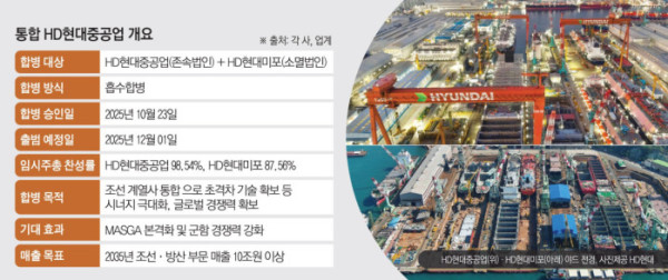 HD현대중공업과 HD현대미포가 통합법인으로 다시 태어난다. 양사의 합병안이 주주총회를 통과하면서 올해 말 공식 출범할 ‘통합 HD현대중공업’은 단순한 계열사 재편을 넘어 한미 조선협력 프로젝트 마스가((MASGA)를 염두에 둔 전략적 포석으로 읽힌다. 전 세계 조선사들이 합병과 경쟁력 강화에 나선 가운데 HD현대가 선택한 ‘원팀 전략’이 K-조선업의 새로운 분기점이 될지 귀추가 주목된다.