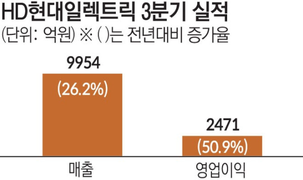 23일 HD현대일렉트릭은 올해 3분기 연결 기준 매출 9954억 원, 영업이익 2471억 원을 기록했다고 밝혔다. 전년 동기 대비 매출은 26.2%, 영업이익은 50.9% 증가했다. 영업이익률은 24.8%로 분기 기준 역대 최대치다.