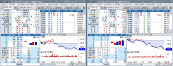 외국인은 3선과 10선을 대량 매도했다. 3선에서는 2만7114계약을 순매도해 지난달 26일(-2만7741계약) 이후 한달만에 일별 최대 순매도를 보였다. 10선에서는 5170계약을 순매도해 10일(-6874계약) 이래로 가장 많은 매도세를 보였다. 반면, 금융투자는 3선 1만6489계약을, 10선 5407계약을 각각 순매수하며 대응했다.