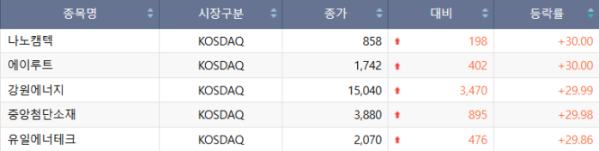 코스닥 시장에서는 나노캠텍, 에이루트, 강원에너지, 중앙첨단소재, 유일에너테크가 상한가를 기록했다.