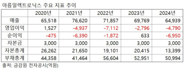 이에 아름일렉트로닉스의 외부감사인은 2024년도 감사보고서에서 처음으로 회사의 순손실 지속과 함께 유동부채가 유동자산을 초과하는 상황 등을 ‘계속기업 가정에 유의적인 의문을 제기하는 요인’으로 꼽았다. 이러한 재무적 위기 상황과 외부 신용 경색 속에서 아름일렉트로닉스는 결국 오너로부터의 직접적인 자금 수혈을 통해 운영자금을 조달하게 된 것으로 풀이된다.