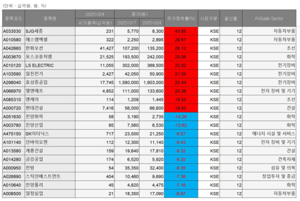 포스코퓨처엠(25.06%), LS ELECTRIC(22.02%), 일진전기(21.05%), 효성중공업(20.44%), 엘앤에프(20.36%), 엔케이(19.52%), 현대건설(18.93%)