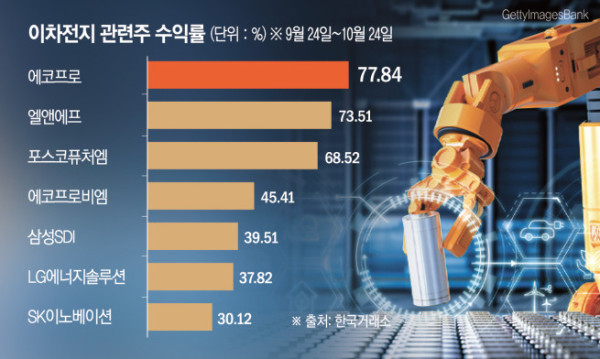 관련 종목 중에서는 대장주 LG에너지솔루션(37.82%)을 비롯해 엘앤에프(73.51%), 포스코퓨처엠(68.52%), 삼성SDI(39.51%), SK이노베이션(30.12%) 등이 급등했다. 코스닥시장에서는 에코프로(77.84%), 에코프로비엠(45.41%) 등 시가총액 상위 종목 상승세가 두드러졌다.