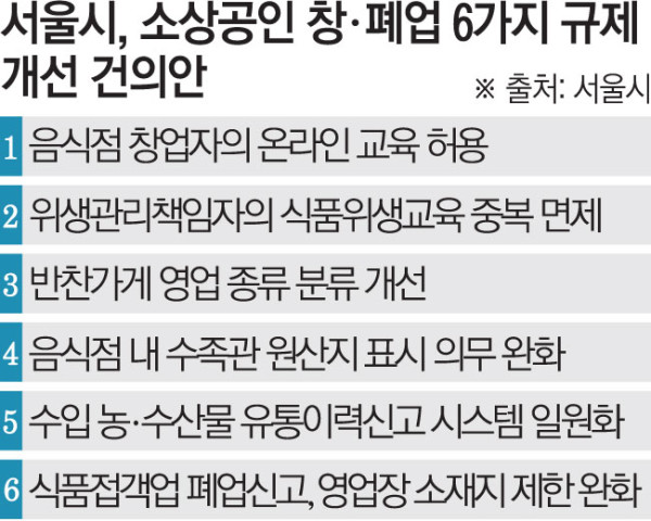 서울시가 소상공인이 겪는 불합리한 규제를 개선하고 경영 환경을 개선하기 위해 정부에 제도 개선을 건의했다. 이번 건의안에는 온라인 식품위생교육 허용, 반찬가게 영업 기준 통일 등 현장 목소리를 반영한 6가지 과제가 담겼다.