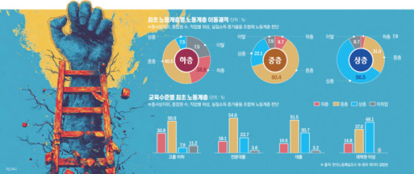 고졸 이하는 중층 시작률이 50.0%, 상층 시작률은 7.9%에 불과했다. 반면, 전문대졸은 54.6%가 중층, 23.7%는 상층에서 출발했다. 대졸은 중층 시작률이 51.5%로 전문대졸보다 다소 낮았으나, 상층 시작률이 30.7%로 높았다. 특히 대학원 이상은 절반에 가까운 48.1%가 첫 노동계층이 상층이었다. 중층은 37.0%였다.