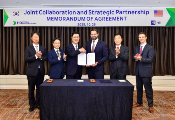 26일 HD현대는 헌팅턴 잉걸스와 ’상선 및 군함 설계·건조 협력에 관한 합의각서(MOA)’를 체결했다고 밝혔다. 이는 한국과 미국 간 군수지원함 분야의 첫 협력 사례다. 체결식은 주원호 HD현대중공업 특수선사업부 사장과 에릭 츄닝 헌팅턴 잉걸스 전략 개발 총괄 부사장 등이 참석한 가운데 아시아태평양경제협력체(APEC) 정상회의가 열리는 경북 경주의 라한셀렉트 호텔에서 열렸다.