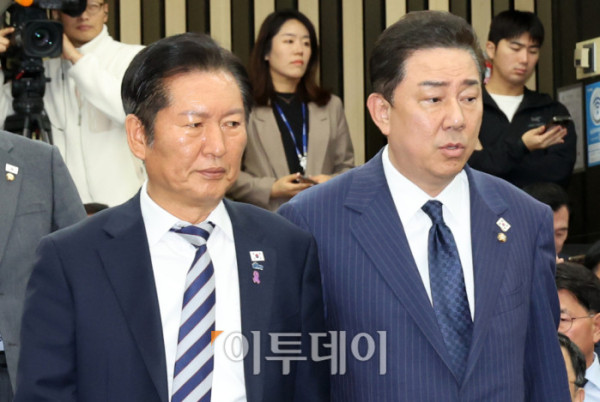 ▲정청래(왼쪽) 더불어민주당 대표와 김병기 원내대표가 26일 서울 여의도 국회에서 열린 의원총회에 참석하고 있다. 고이란 기자 photoeran@