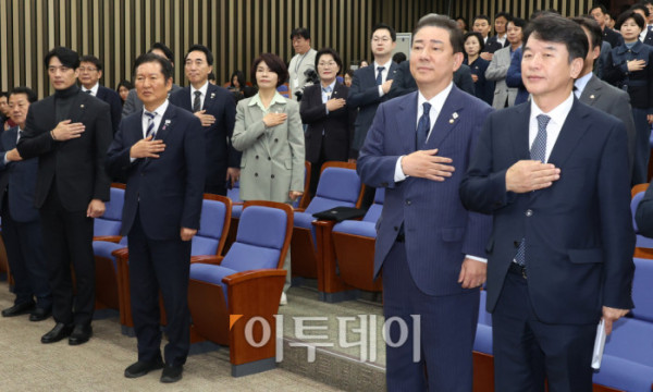 ▲정청래(앞줄 왼쪽 세번째) 더불어민주당 대표와 김병기(앞줄 오른쪽 두번째) 원내대표가 26일 서울 여의도 국회에서 열린 의원총회에서 참석자들과 국민의례를 하고 있다. 고이란 기자 photoeran@