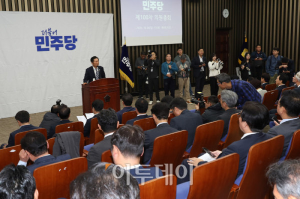 ▲김병기 더불어민주당 원내대표가 26일 서울 여의도 국회에서 열린 의원총회에서 발언을 하고 있다. 고이란 기자 photoeran@