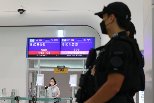 ▲ 캄보디아에서 한국인 납치·구금 사태가 발생해 논란을 빚고 있는 가운데 15일 인천국제공항 제2여객터미널 캄보디아행 항공편 탑승구에서 인천국제공항 경찰단 대테러기동대 대원들이 대기하고 있다. (연합뉴스)