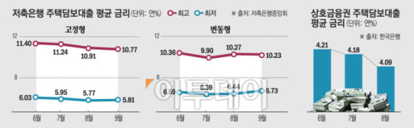 27일 저축은행중앙회 공시에 따르면 아파트·주택을 담보로 한 저축은행의 고정형 주담대(일반자금대출 포함) 최고금리는 9월 기준 연 10.77%로 나타났다. 7월 연 11.24%에서 8월 10.91%로 떨어진 데 이어 연달아 하락세를 이어간 것이다.