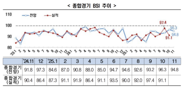 BSI 전망치는 2022년 4월(99.1)부터 3년 8개월 연속 기준선을 밑돌고 있다. 10월 BSI 실적치도 91.1로 3년 9개월간 부진했다.