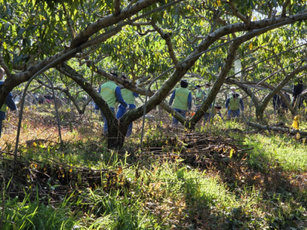 ▲경기농협 임직원과 의정부교도소 보라미 봉사단원 등 20여 명이 양주시 백석읍 복숭아 농가에서 나무 아래에서 폐자재를 수거하고 전지작업을 하고 있다. (경기농협)