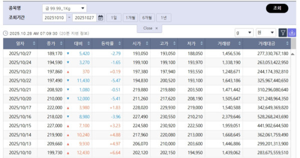 미니금(100g 기준) 가격도 하락했다. 이날 종가는 19만4500원으로 전일 대비 1만300원 하락하며 최근 10거래일 사이 가장 큰 하락 폭을 기록했다.