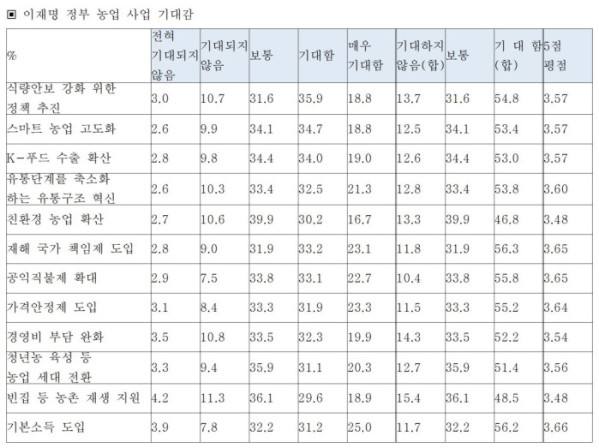 농민들이 가장 기대하는 농업사업으로는 ‘농민기본소득 도입’(3.66점)이 꼽혔으며 공익직불제 중에서는 ‘청년직불제’(3.43점)가 가장 높게 나타났다. ‘동물복지직불제’, ‘친환경·탄소중립직불제’도 각각 3점 이상으로 긍정적인 평가를 받았다.