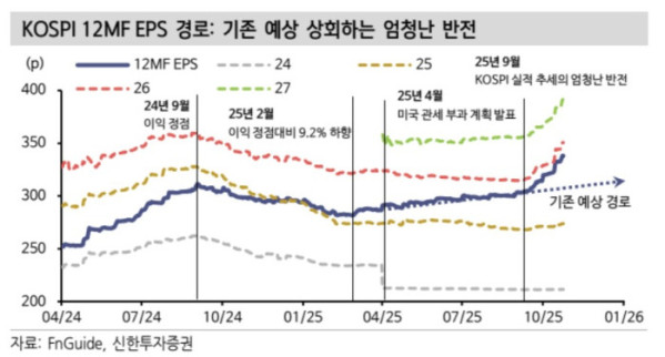 보고서에 따르면 코스피의 상승은 올해 중반 '유동성 장세'로 시작했으나, 최근에는 기업 실적 상향이 뒷받침되면서 본격적인 '실적 장세'로 전환되는 양상이다. PER 상승과 주당순이익(EPS) 개선이 동시에 나타나는 보기 드문 구간에 진입했다는 설명이다.
