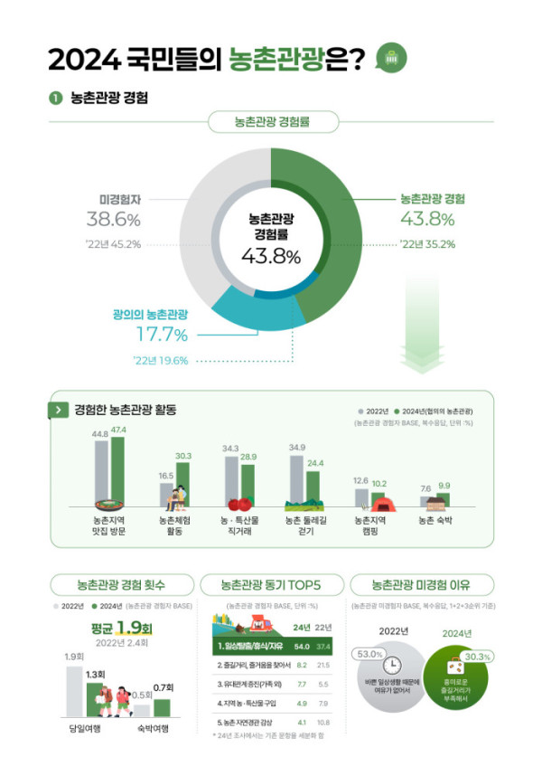농촌진흥청은 2024년 농촌관광 실태조사를 실시한 결과, 농촌관광 경험자가 전체의 43.8%로 집계됐다고 28일 밝혔다.