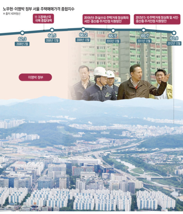 이런 공급 확대 정책은 경기 부양과 건설 경기 방어를 목표로 했지만, 시장의 반응은 냉랭했다. 집값 하락세가 이어지고 매수심리도 좀처럼 살아나지 않았다. KB부동산 주택매매가격지수 통계에 따르면 2008년 2월 57이었던 종합지수는 2013년 2월 66에 그쳤다. 같은 기간 서울은 57에서 56을 유지했다.