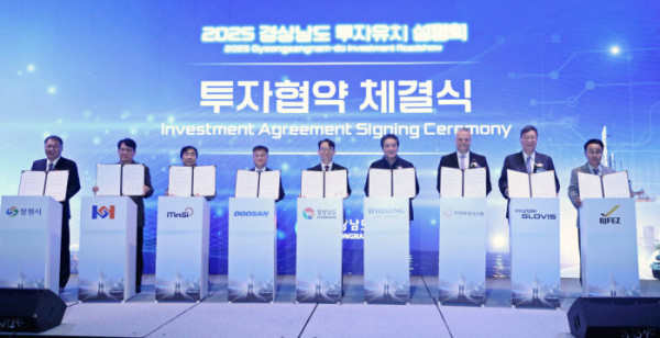 현대글로비스는 28일 서울 중구 웨스틴조선호텔에서 경상남도와 창원시, 부산진해경제자유구역청과 ‘부산신항 복합물류센터 구축을 위한 다자간 투자협약(MOU)'을 체결했다고 밝혔다. 체결식에는 이규복 현대글로비스 사장, 김명주 경상남도 경제부지사, 장금용 창원시장 권한대행, 박성호 부산진해경제자유구역청장 등 관계자 300여 명이 참석했다.