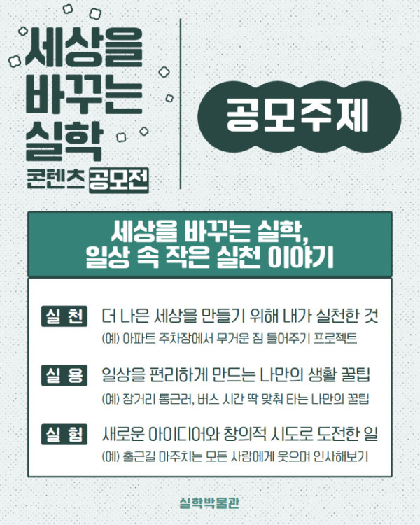 ▲실학박물관이 세상을 바꾸는 실학정신을 주제로 실천, 실용, 실험 등 일상 속 작은 실천 이야기를 모집하는 공모전을 안내하고 있다. (경기문화재단)