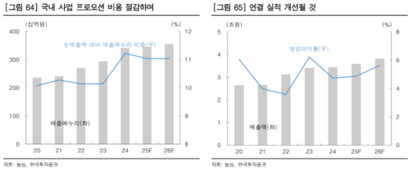 강은지 한국투자증권 연구원은 "농심의 3분기 해외 법인 실적에 대한 투자자들 눈높이는 이미 낮아졌다"며 "이제는 케이팝 데몬 헌터스 콜라보와 신라면 툼바의 미국 메인스트림 진입 본격화로 개선될 4분기와 2026년 실적에 집중해야 할 때다. 케이팝 데몬 헌터스 콜라보 제품은 8월 말 한국에서 판매를 시작했고 해외는 9월 중순 미국을 시작으로 유럽, 오세아니아, 동남아시아 주요 국가에 유통되기 시작한 가운데 이를 통해 신규 소비자 유입을 견인할 수 있으며 이는 중장기적인 수요 기반 확대와 실적 성장에 긍정적으로 작용할 전망"이라고 짚었다.
