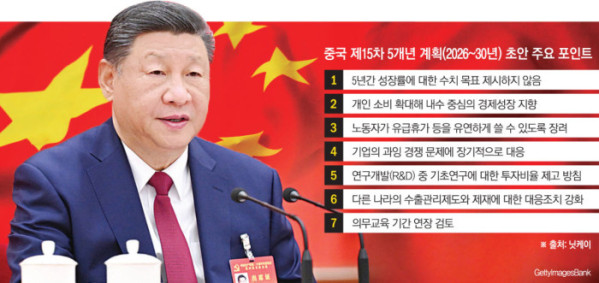 중국 공산당이 2026년부터 2030년까지 향후 5년간의 경제 발전 계획을 담은 로드맵인 ‘제15차 5개년 계획’의 초안을 발표했다. 소비 확대와 내수 중심 성장으로 전환하자는 것이 골자이지만 구체적 수치가 모호하다는 지적이 나오고 있다.