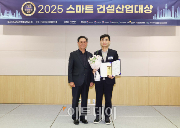 29일 서울 여의도 FKI타워 컨퍼런스센터에서 열린 ‘2025 스마트 건설산업대상’에서 아파트부문 최우수상인 이투데이대표이사상을 수상한 장승복 현대건설 주택사업본부 상무가 시상자인 이종재 이투데이그룹 미디어부문 부회장 겸 대표이사와 기념촬영을 하고 있다. 이투데이가 주최한 ‘2025 스마트 건설산업대상’은 올바른 건설문화와 고용창출, 스마트 시대를 선도할 건설산업 유관 업체들의 성과를 발굴하고 이를 대내외에 알려 업계의 건전한 경쟁을 유도하기 위한 자리다.