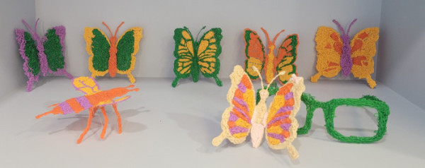 ▲어린이들이 만든 코딩과 3D펜으로 제작한 여러 색상의 나비와 안경 모양 작품이 전시되어 있다. (경기문화재단)