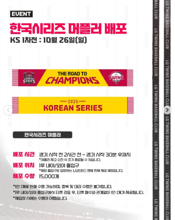 ‘LG트윈스 한국시리즈 2025 머플러’는 KBO리그 한화 이글스와 LG 트윈스의 1차전 경기 날인 26일에 1만 5000개 한정으로 무료로 배포됐다.