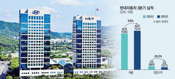 현대자동차의 올해 3분기 영업이익이 미국발 고율 관세 여파로 30% 가까이 급감했다. 북미·유럽 시장과 하이브리드 차량 판매 호조로 역대 3분기 기준 최대 매출을 달성했지만 대외 악재가 발목을 잡았다. 다만 아시아태평양경제협력체(APEC) 정상회의를 계기로 열린 한미 정상회담에서 25% 고율 관세가 15%로 인하되면서 4분기부터는 수익성 개선이 이뤄질 것으로 예상된다.