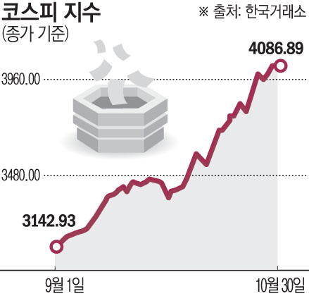 30일 코스피는 전 거래일 대비 5.74포인트(pㆍ0.14%) 오른 4086.89로 마감하며 이틀 연속 역대 최고치를 경신했다. 지수는 4105.95로 출발해 장중 4146.72까지 오르기도 했다. 장중 등락을 거듭한 뒤 마감 직전 보합 수준까지 하락하며 상승 폭을 대부분 반납햇다. 코스닥은 1.19% 내린 890.86으로 이틀 연속 하락했다.