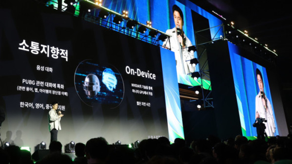 두 번째로 ‘PUBG 앨라이’는 음성 대화가 가능하다고 밝혔다. 그는 “게임 관련 대화에 특화되어 있으며, 배틀그라운드 용어와 맵, 아이템의 장단점을 이해하고 자연스럽게 대화한다”고 했다. 또한 “영어, 한국어, 중국어 3개 언어를 지원하며, 온디바이스에서 작동하기 때문에 지연 시간이 매우 짧다”고 덧붙였다.