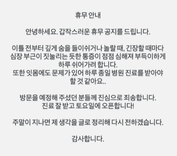 해당 카페를 운영하는 사장 A씨는 30일 인스타그램 공식 계정에 ‘휴무 안내’ 게시물을 올렸다. 그는 “이틀 전부터 깊게 숨을 들이쉬거나 놀랄 때, 긴장할 때마다 심장 부근이 짓눌리는 듯한 통증이 점점 심해져 부득이하게 하루 쉬어가려 한다”고 공지했다. 그러면서 “잇몸에도 문제가 있어 하루 종일 병원 진료롤 받아야 할 것 같다”고 덧붙였다.