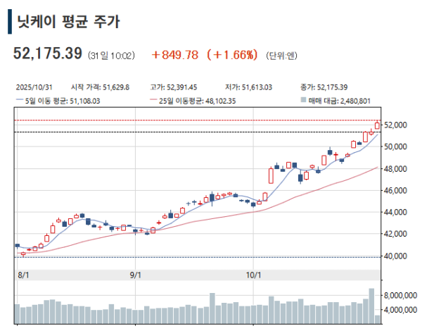 31일 니혼게이자이신문(닛케이)에 따르면 한국시간 오전 10시 2분 현재 닛케이지수는 전 거래일 1.66% 상승한 5만2175.39에 거래되고 있다. 지수는 한때 5만2391.45까지 오르기도 했다.