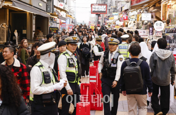 ▲핼러윈데이인 31일 서울 마포구 홍대거리에서 경찰들이 인파 관리를 하고 있다. 조현호 기자 hyunho@