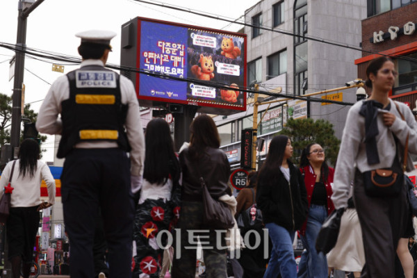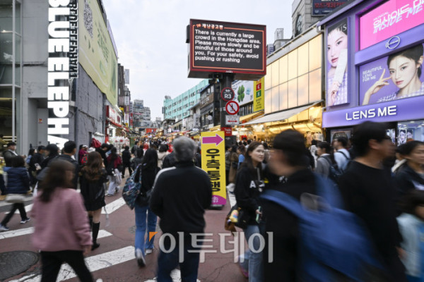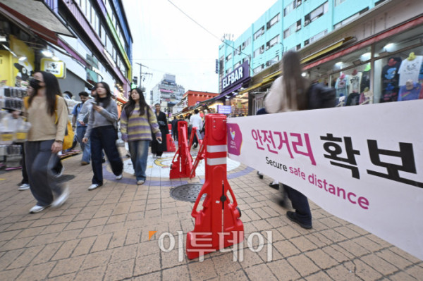 ▲핼러윈데이인 31일 서울 마포구 홍대거리에 '안전거리 확보' 안내문이 게시돼 있다. 조현호 기자 hyunho@