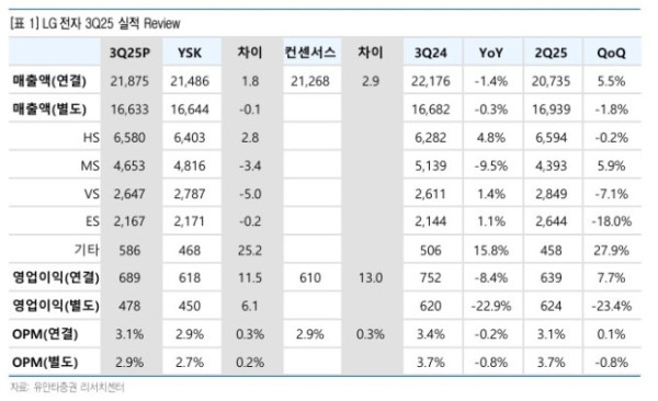 올 3분기 LG전자는 별도 기준 매출액 16조6326억 원, 영업이익 4782억 원을 기록했다. 시장 컨센서스를 웃돈다. 고선영 유안타증권 연구원은 "예상보다 양호했던 HS, VS사업부의 실적을 감안하더라도 희망퇴직으로 반영된 약 1000억원 규모의 비용 여파로 MS 사업부의 적자폭이 예상보다 더 컸다"며 "3분기부터 반영된 관세 영향과 지정학적 리스크, 이로 인해 불가피했던 글로벌 수요 위축은 경쟁 구도 심화로 이어지며 전반적인 리스크 요인으로 작용했다"고 짚었다.