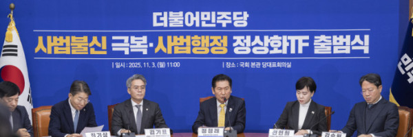 정 대표는 “전현희 단장을 중심으로 사법불신 극복·사법행정 정상화 TF가 공식 출범한다”며 “국민의 사법 신뢰를 다시 세우고 정의로운 나라로 나아가기 위한 또 하나의 중요한 과제를 집중적으로 공론화하고 토론하겠다”고 밝혔다.